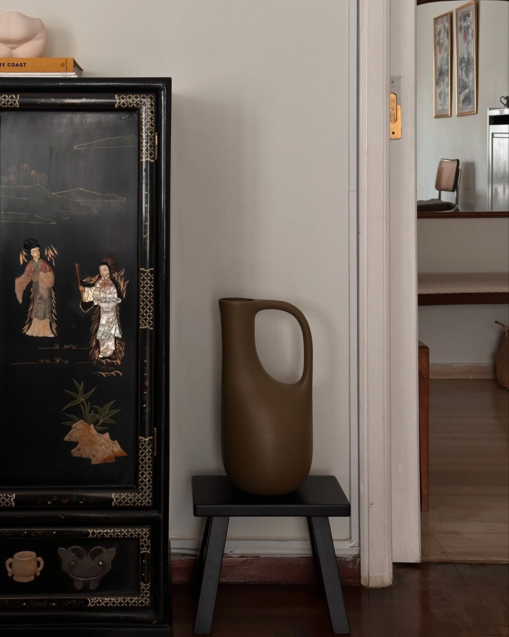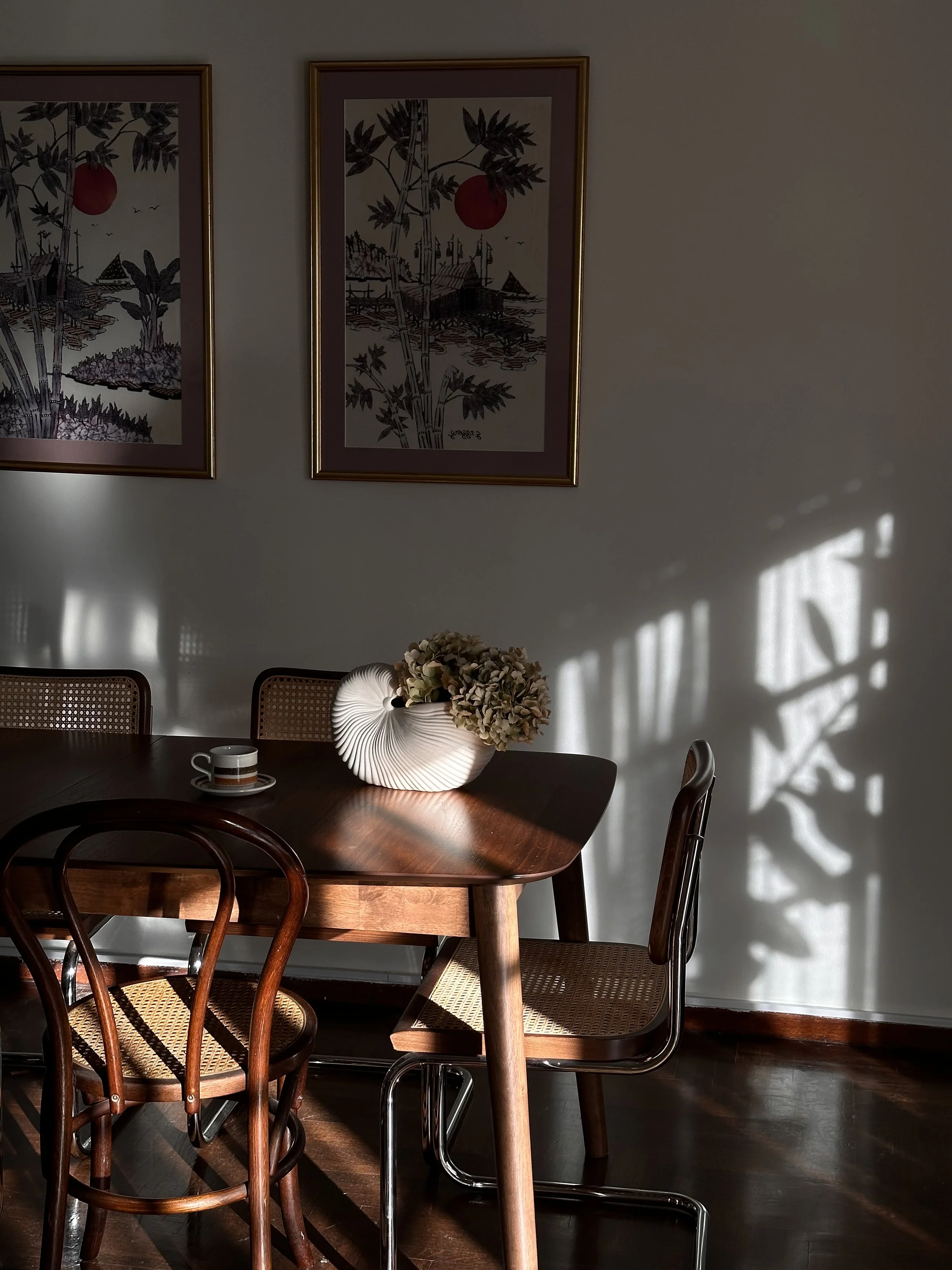 My ferm LIVING shell pot, paired with vintage coffee cups and second-hand Asian paintings.
